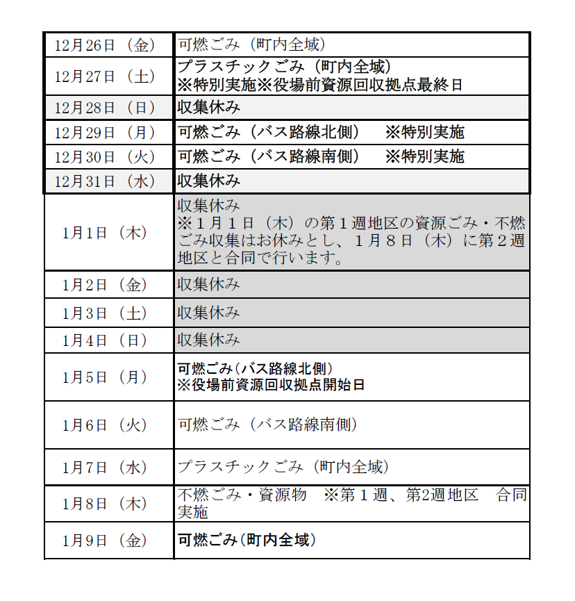 年末・年始におけるごみ収集日を以下のとおり変更します。